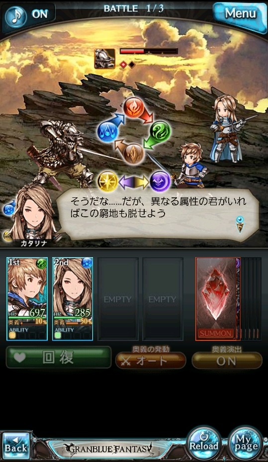 まずは1つ目のバトルについて説明します。「グランブルーファンタジー」を始めて間もない頃は主にメインストーリーを進めることになると思うので、今回はソロプレイについて書きます。