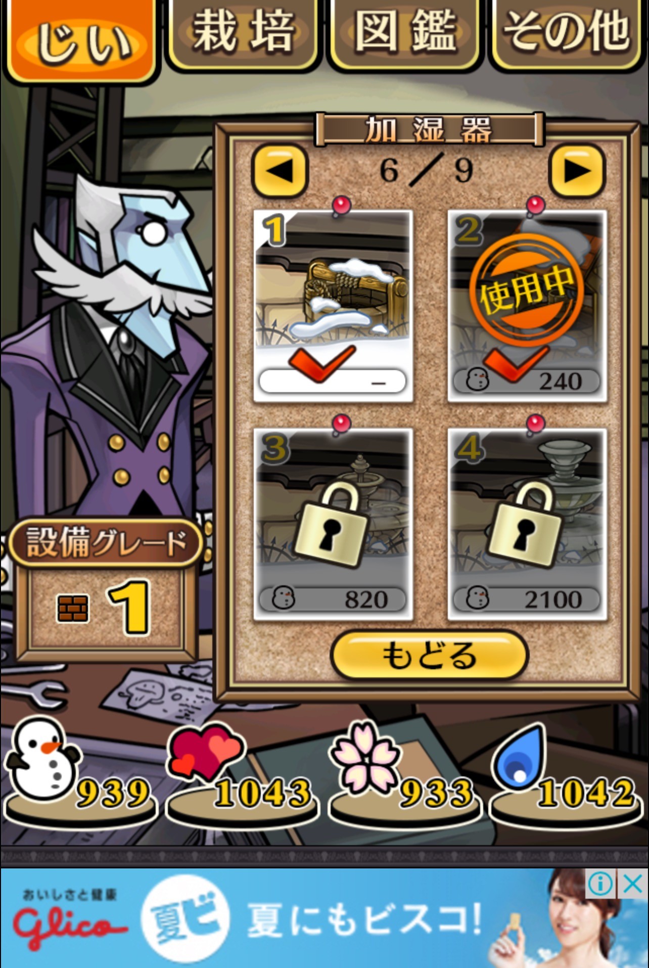 今作では、設備(加湿器、保湿器、照明器)を交換することで、栽培室の「季節」を変えることができます。