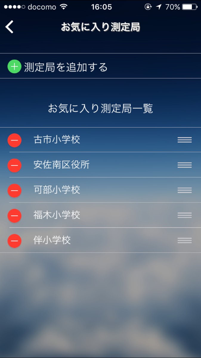 画面右上のボタンをタップすると、いくつかのアイコンが出てきます。お気に入りの測定局を追加するには、アイコン右上の四角マークをタップしましょう。その後、都道府県から選択したいところを選び近くにある測定局を選択します。