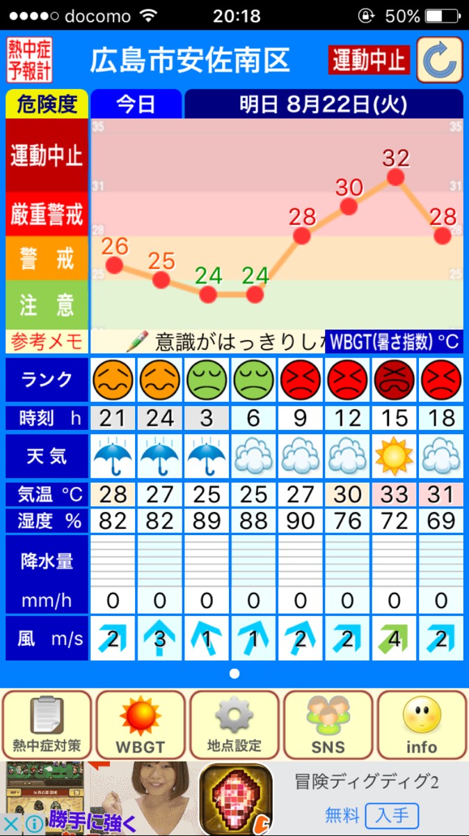 暑さ指数の値がわかっても、どのくらい危険なのかわかりにくいですよね。このアプリなら、暑さ指数と一緒に折れ線グラフで危険度を表示してくれます。グラフなら危険度がわかりやすいですね。