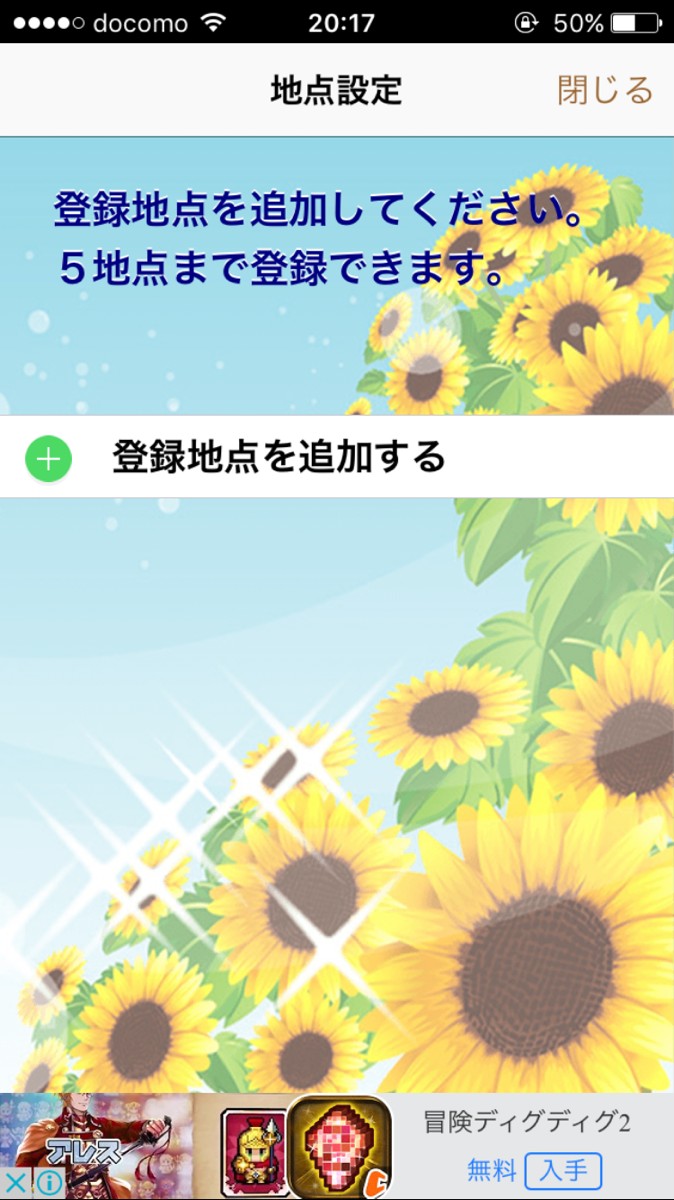 アプリ起動後、まだ熱中症予報計は表示されません。値を表示するには、画面下の「地点設定」ボタンをタップして、登録地点を設定しましょう。登録地点の設定は全国各地点選択可能で、最大5地点選ぶことができます。