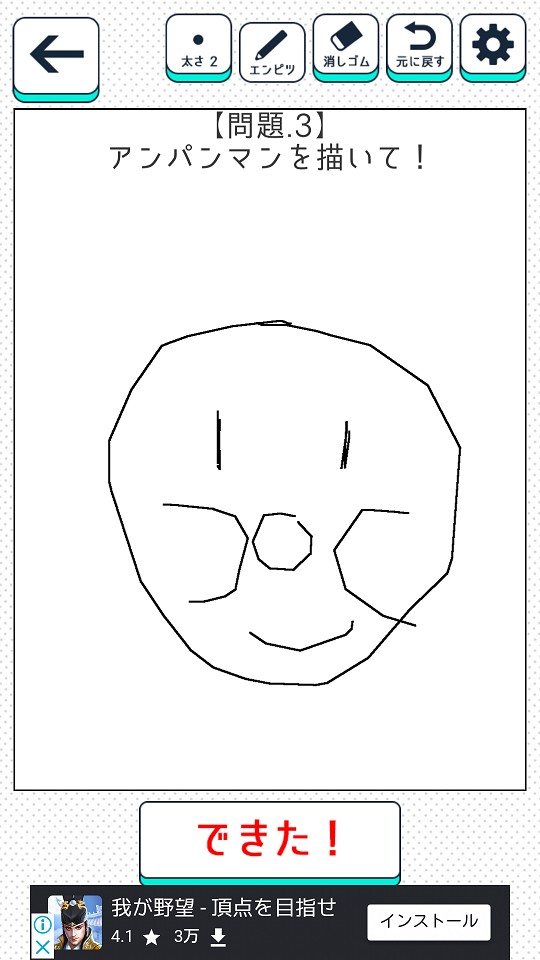 画伯の腕前を試されるお絵かきクイズです。まずはお絵かきのお題を決めましょう。問題は順に遊んでいくことで開放されます。出来は問わないのでランダムに出題したい人は先に全部クリアしてしまうのも手です。お題を選んだら、それをなぞって描写してください。うろ覚えなのでもちろんヒントを探してはいけません。ツールはえんぴつ・太さ(1~3)・消しゴムがあります。描き終わったら画面下の「できた」を押して完了です。お題の画像と自分が描いた絵を見比べることができます。