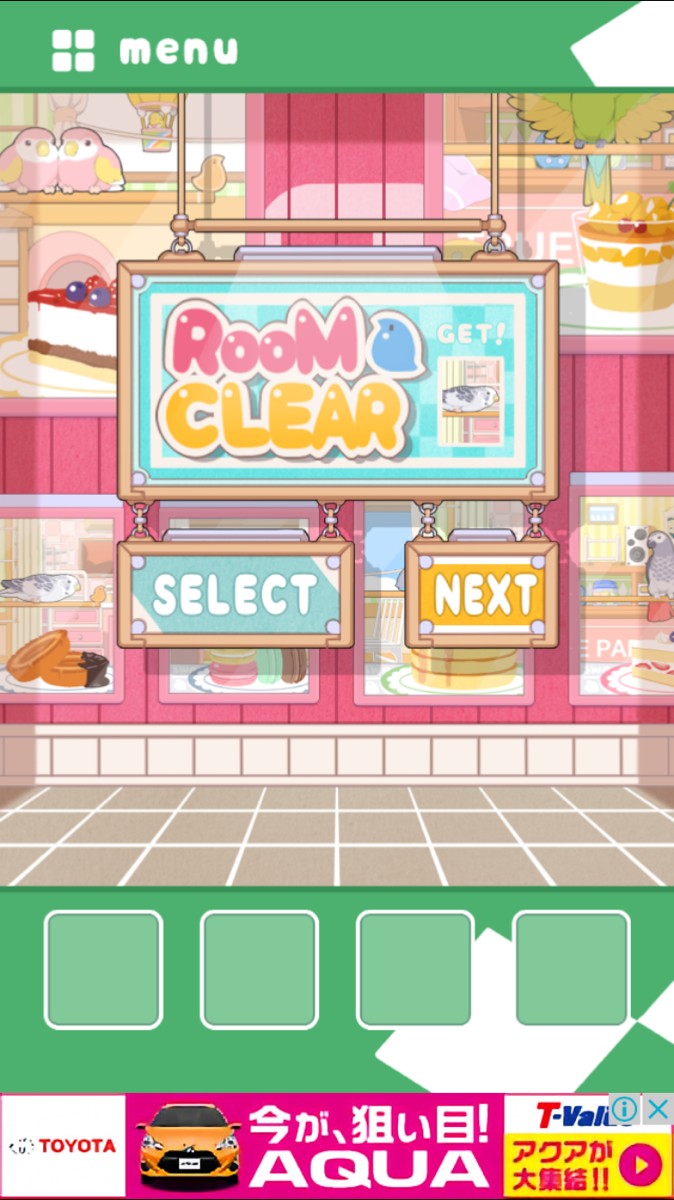 「インコ脱出」を実際に使ってみたので、ゲームの流れをご紹介します。まずアプリを開いて、スタートのボタンを押すと出てくるのが、「ROOM SELECT」の画面です。「ROOM01」を選択し、この部屋からの脱出方法を探っていきます。部屋のいろんなところをタップしていくと、アイテムがゲットできたり、部屋から脱出するためのカギの操作が可能です。謎を解いて、どんどん次の部屋へ進んでみてください。初めの方は、ヒントが書いてあり、簡単に次の部屋へ進めるでしょう。部屋の中にいるインコがヒントになっているので、よく観察してみてくださいね。脱出方法がわからなくて困ったときは、「menu」ボタンを押せば、ヒントをもらうこともできます。インコの動きや色使いが、可愛らしいのも特徴です。ステージが多く、どんどん難易度が上がっていくので、やりがいのある脱出ゲームでしょう。