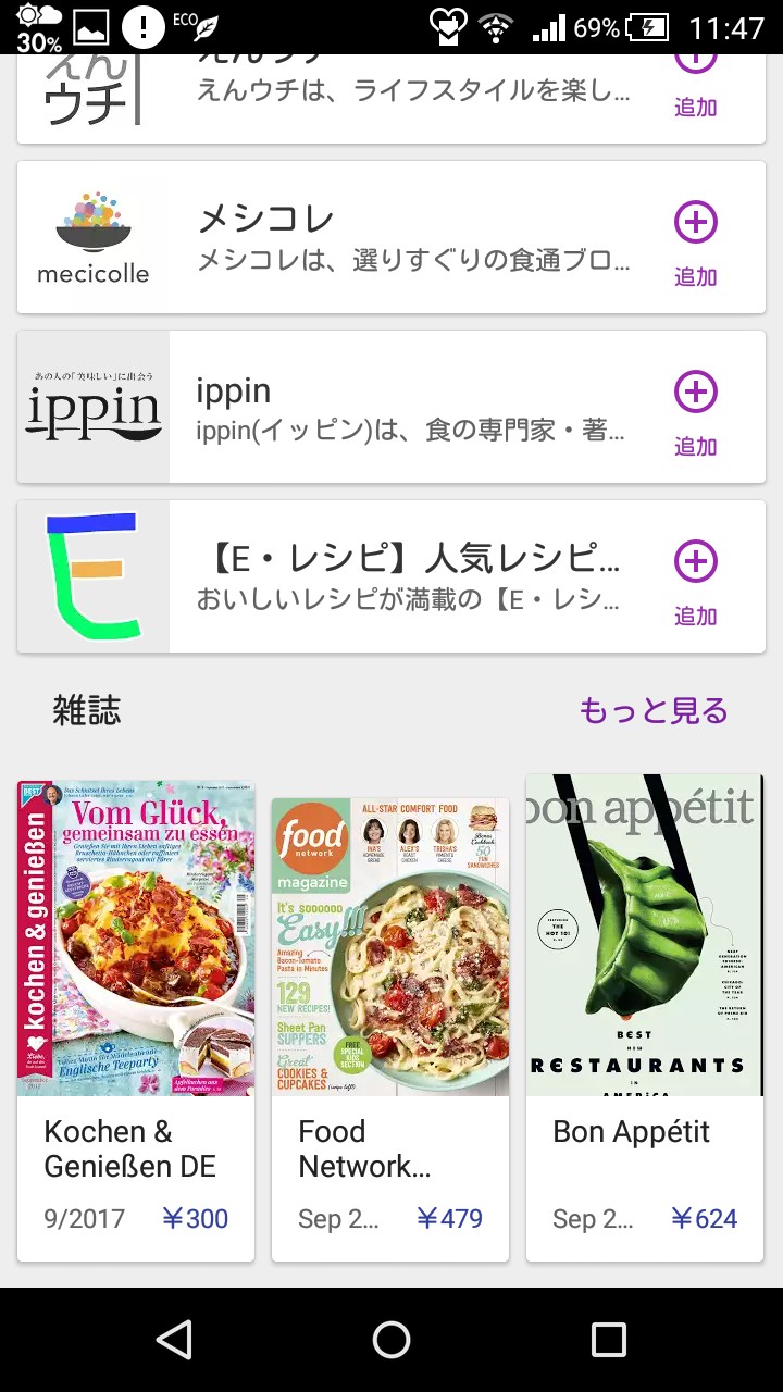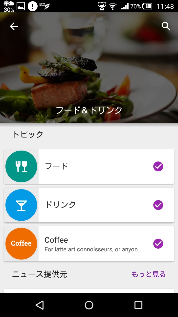 「Google Play ニューススタンド」なら、「ニュース」や「スポーツ」といった速報性が重要なニュースサイトはもちろん、自分の興味や関心のある分野のニュースに簡単にアクセスできます。たとえば、「フード&ドリンク」のジャンルに興味や関心があれば、その分野の情報を専門的に提供しているサイトを登録しておきましょう。それだけで「ライブラリ」から好きな情報に簡単にアクセスできます。