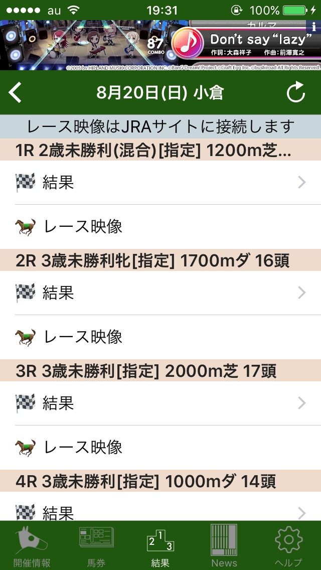 開催日と競馬場が表示されているので、結果確認したい競馬場をタップすると各レースの結果とレース映像を見ることができます。見逃してしまったレースを見ることができるのは嬉しいサービスですよね。