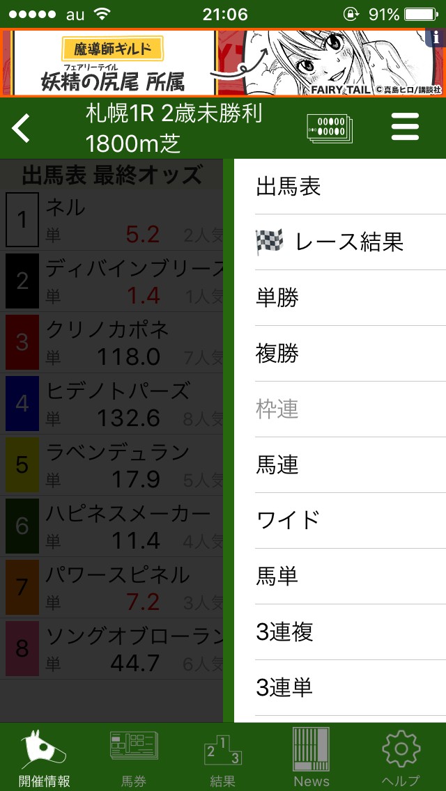 オッズは「単勝」「枠連」「3連単」など8項目が一覧で表示されていて、タップするだけで切り替えて見ることができます。