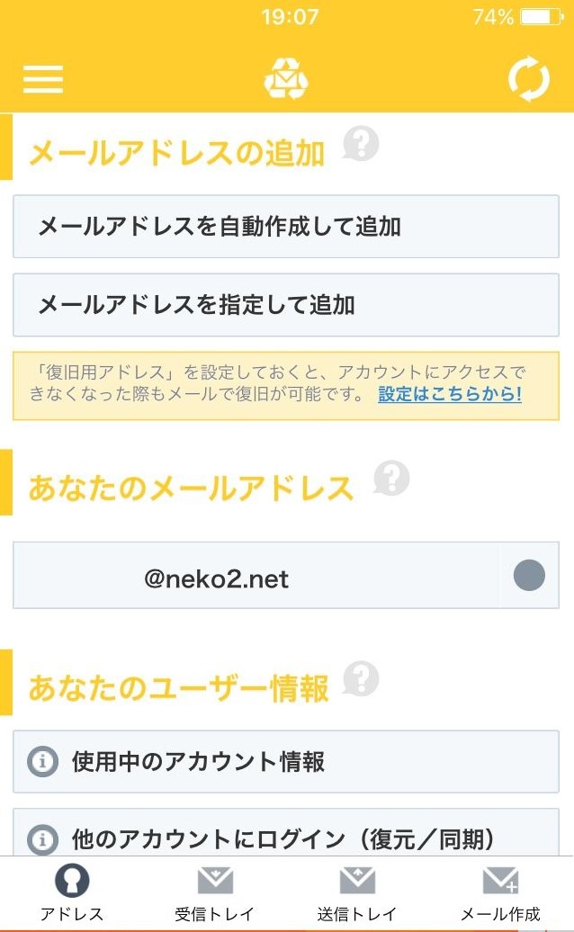 アプリをダウンロードして立ち上げると、いきなり一つのメアドが提供されます。