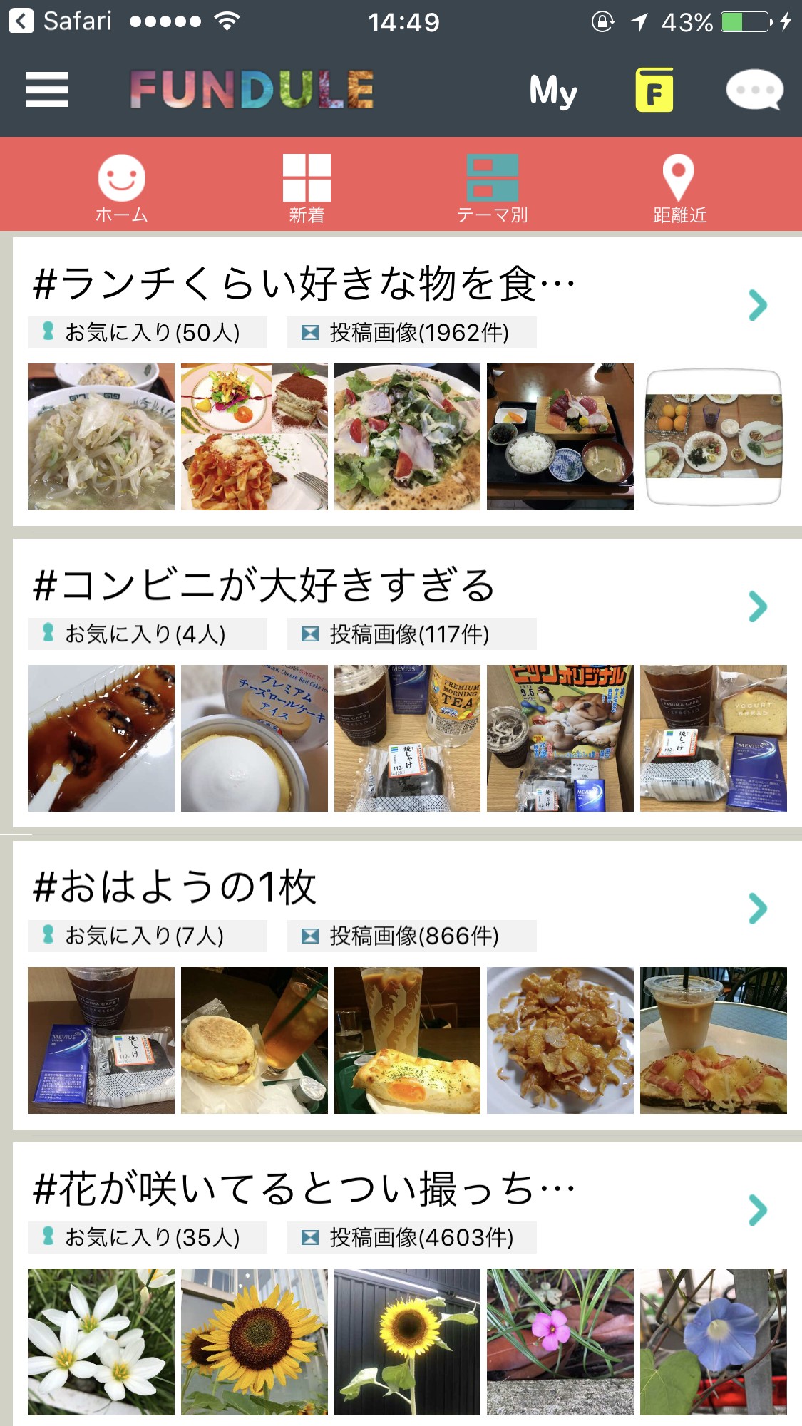 新着では新しい投稿順に並びますが、テーマ別では様々なテーマから投稿された写真を見ることができます。テーマは「ランチ」「休日の過ごし方」「コンビニが大好き」「おはようの1枚」「ご褒美スイーツ」「夏色写真館」「今日は何食べた?」「手作りごはん」「やってみた! 撮ってみた!」「カワイイ!?いきもの図鑑」「誰かに見せたいこの風景」など様々です。楽しそうなもの、美味しそうな物、行きたい場所などの情報を見つけることができますよ。