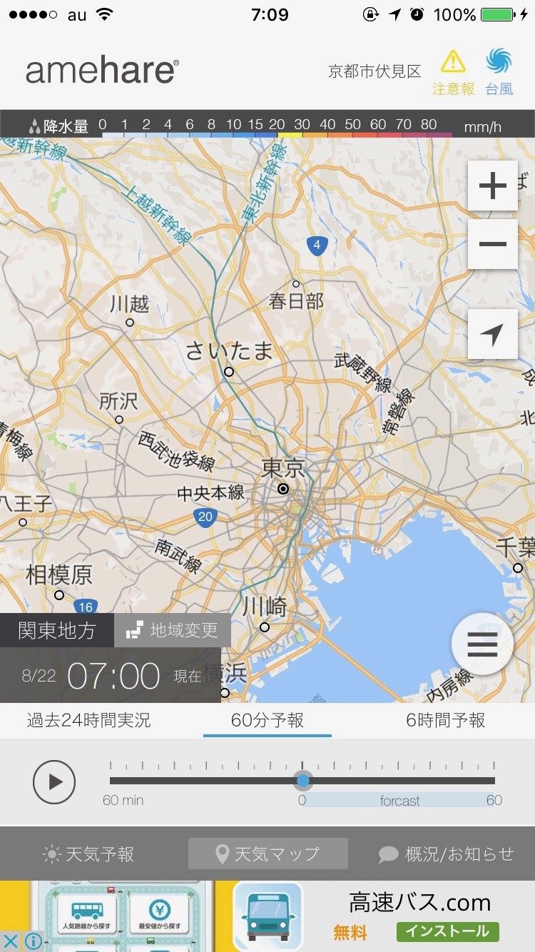 メイン画面の下部に3つのタブがあります。その真ん中にある天気マップをタップすると地図画面上の雨雲レーダーに切り替わります。ここでは、過去24時間と1時間先の予報を5分ごとと6時間先の予報を1時間ごとに分けて見ることができます。今いる地点の雨雲の様子だけでなく、職場や学校などこれから行く目的地の様子まで詳細に知ることができ、大変便利です。
