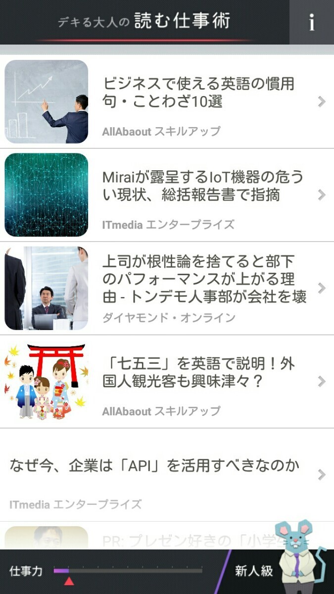 「デキる大人の読む仕事術」でデキる大人になるための極意を学びましょう。「デキる大人の読む仕事術」のコラムは、1日3分で読み終えるもので、通勤中や昼食中といった少しの空いた時間で、誰でも簡単に読めますよ。長い文章だと、読むのに時間がかかり、読むのが次第に億劫になり、大事なポイントも分からなくなります。「デキる大人の読む仕事術」のコラムは、短めに設定することで、大事な要点を見つけやすくなるのです。その結果、毎日コツコツ続くことができ、仕事力を身に付けれます。様々なコラムを読み進めると、「デキる大人の読む仕事術」に登場するネズミがヒヨコへと変化を見ることが出来るのも楽しいですよ。「デキる大人の読む仕事術」で見た記事を、シェアボタンで気軽にシェアできます。その記事について、友人と議論するということも可能ですね。