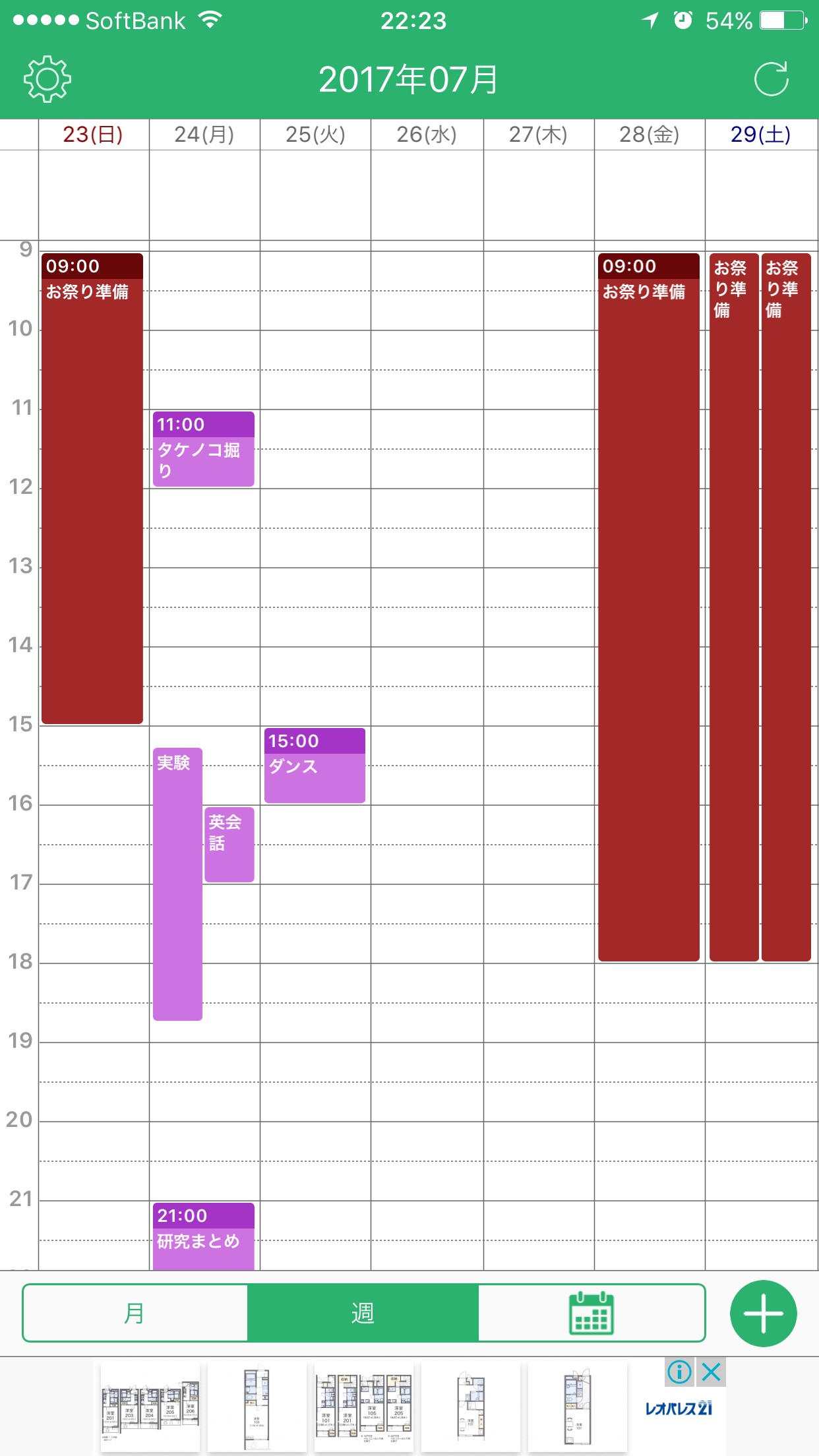 画面下の「週」タブをタップすることで週単位のスケジュールが表示されます。