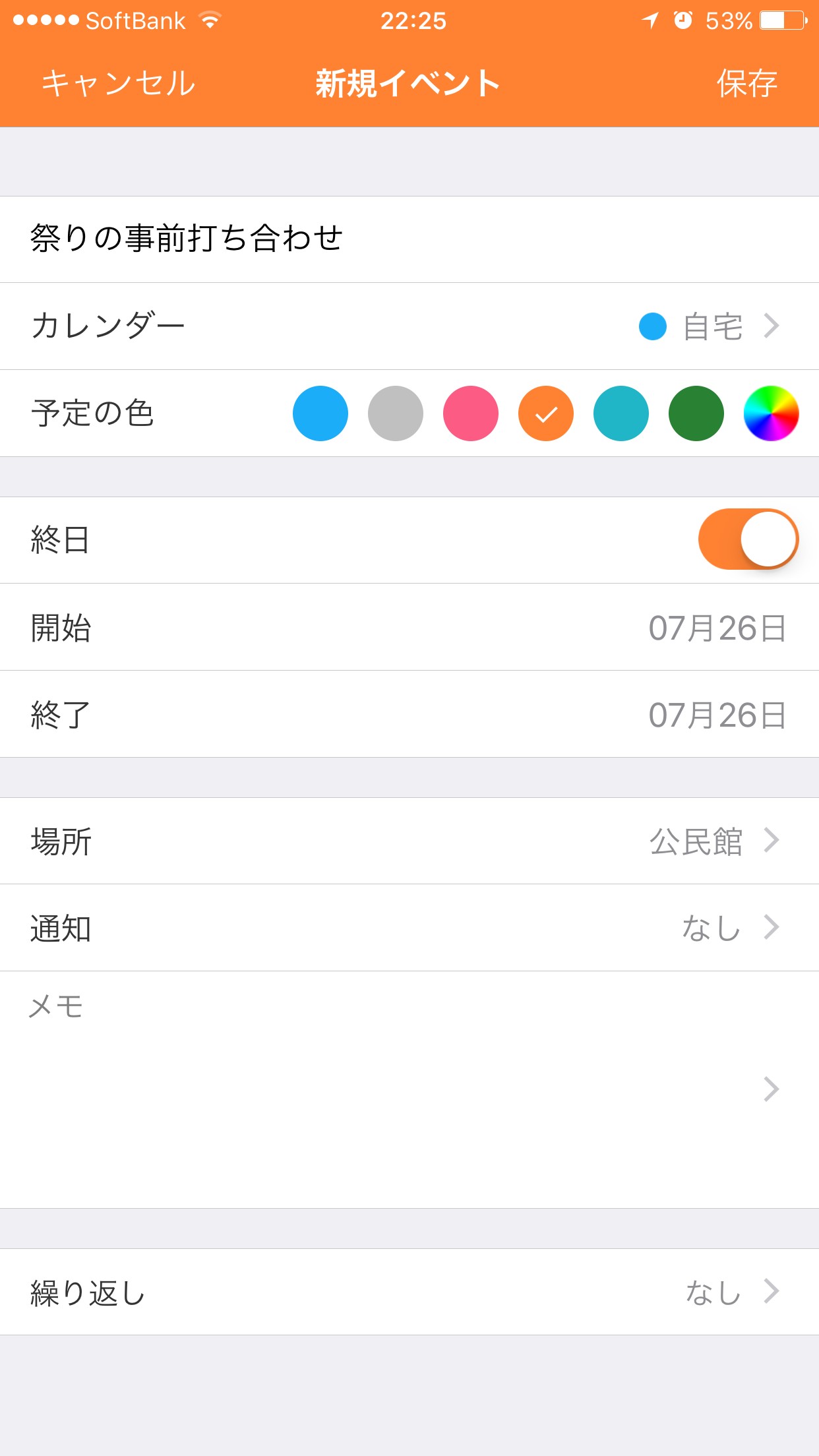 画面下の「+」ボタンをタップすることで新規の予定を登録する画面が開きます。