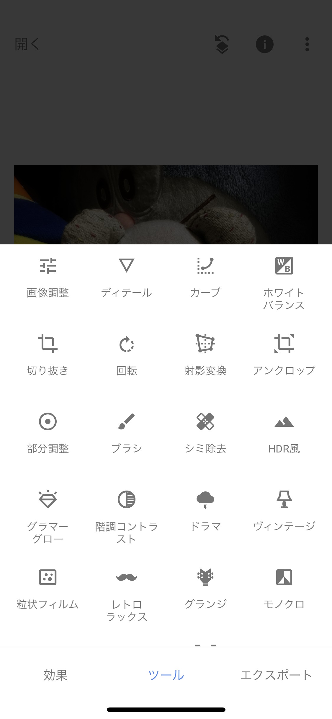 - 加工したい写真を選択したら、画面下部の真ん中にある「ツール」をタップ。