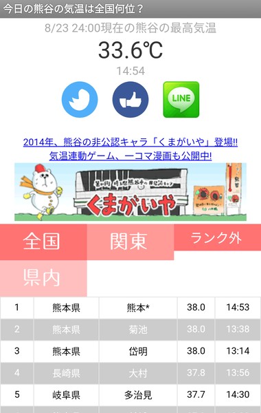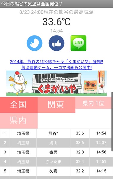 - 「今日の熊谷の気温は全国何位?」は全国、関東、県内別に順位を確認できる
