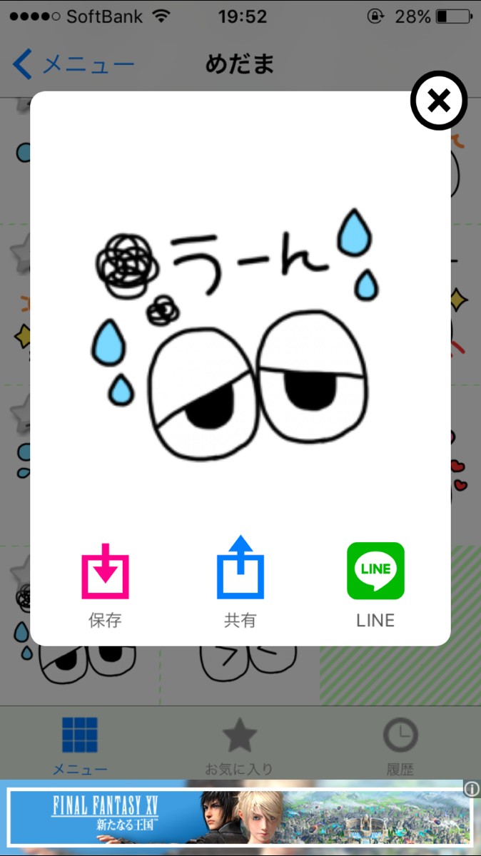 使いたいスタンプを見つけたらタップします。「保存」「共有」「LINE」ボタンが表示されるので、対象となるボタンをタップしましょう。「保存」はカメラロールの保存され、「共有」はiPhoneのメモやコピー、LINE、Twitterなどに共有ができます。「LINE」をタップすると自動起動されるので、送りたい相手を選んで送信します。これだけでスタンプの送信完了です!