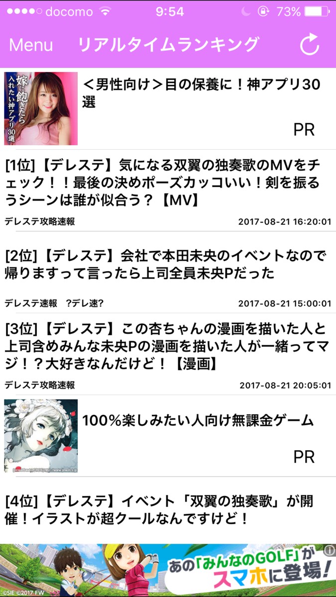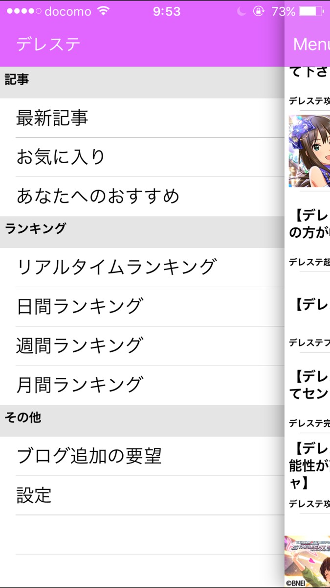 「ブログまとめニュース速報 for アイドルマスター」では、自動で「デレステ」関連記事を更新し、いつもホットな情報を提供してくれます。また、ランキング形式を採用しているので、今一番の注目な話題や、コアな情報「ブログまとめニュース速報 for アイドルマスター」では、自動で「デレステ」関連記事を更新し、いつでもホットな情報を提供してくれます。また、ランキング形式を採用しているので、今一番の注目な話題や、コアな情報までも入手可能です。またランキングは、日間ランキング、週間ランキング、月間ランキングと、見たい所から選べるので、見逃してしまった情報も、さかのぼってみることができて大変便利です。その他にも、自分の見ている記事をアプリが参考にして、あなたへのおすすめ記事を選んでくれるのも有難い機能といえるでしょう。