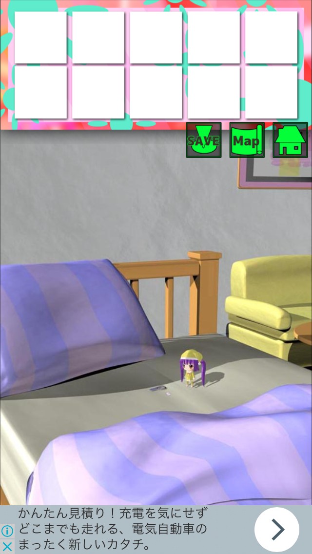 小人になったかわいい少女が普段よりずっと大きく見える部屋を探索していく脱出ゲームです。