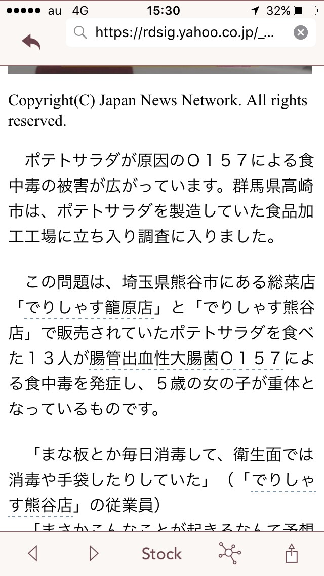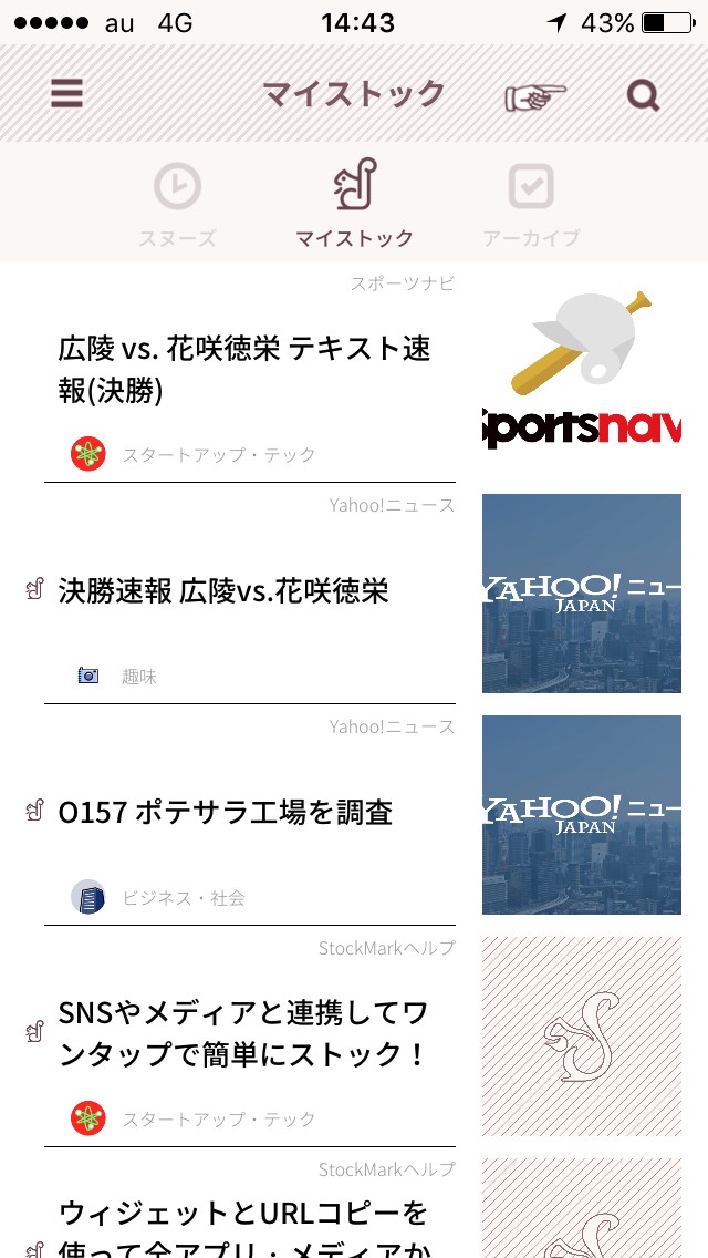 お気に入りのメディアなどから、気になる記事を見つけたら、画面下部の「Stock」をタップしましょう。保存が完了すると「Stock」がリスのマークに変更になりますよ。