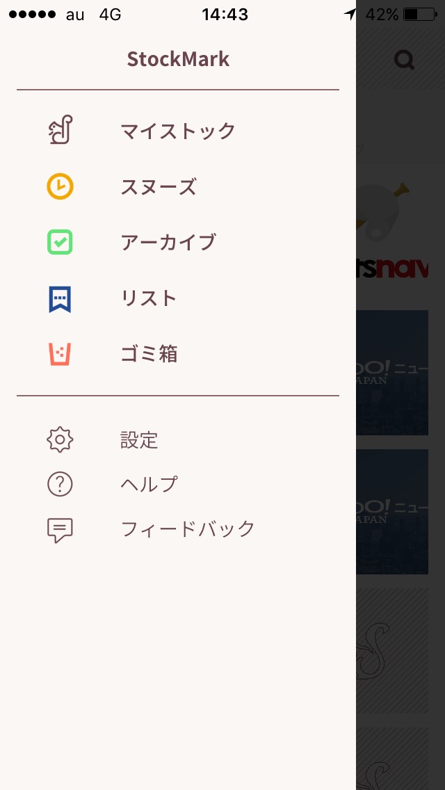 画面左上のリストボタンをタップし「マイストック」を選択します。ストックした記事が表示されますよ。