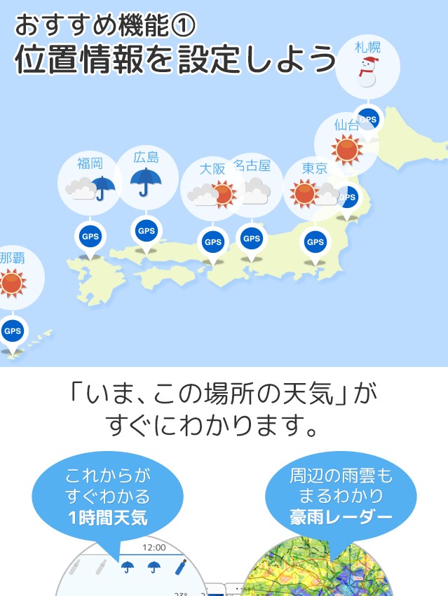 お住いの地域はもちろん、仕事やお出かけをする際の目的地の登録まで行えます。