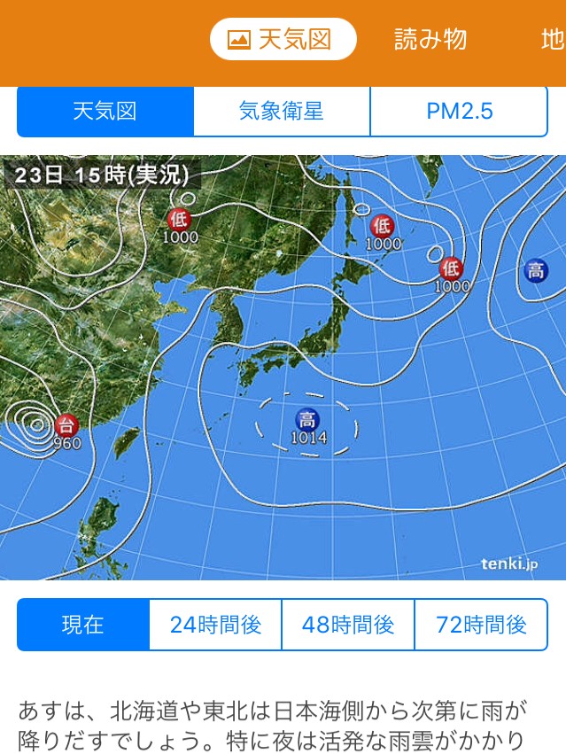 現在・24時間後・48時間後・72時間後毎に天気の動きがチェックできるので、大変便利です。