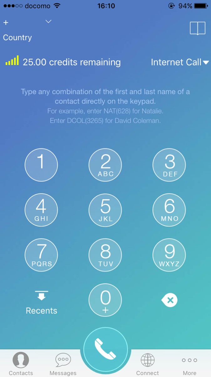 アプリ内は、すべて英語表記です。あなたの電話張から相手を選択し電話をかける場合は「Contacts」を、相手を電話帳から選択しない場合は「Call」をタップします。