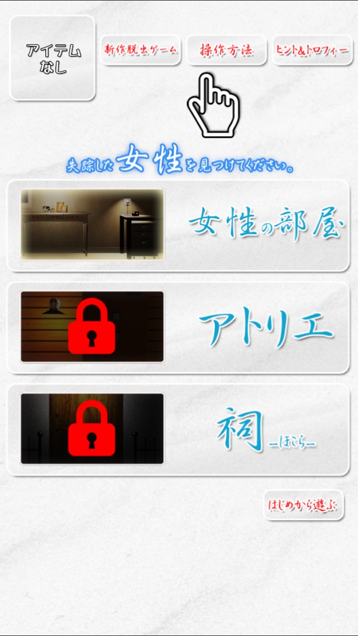 3つのステージは、女性の部屋・アトリエ・祠となっていて1つクリアすると次の場所へ進むことができます。1ステージ完結ではなく続きになっていますが、ステージごとで区切りをつけられるので短時間でもサクッと遊ぶことができます。