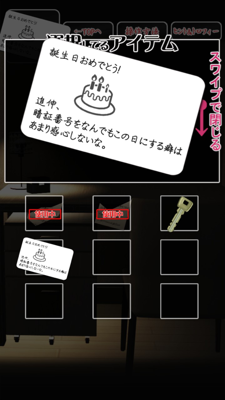 操作方法は、画面をタップしながらゲームを進ませていきます。初心者でもわかりやすいように操作方法をチェックすることもできるので安心です。画面もスッキリと見やすくて操作しやすいです。アイテムはタップで取得するとアイテムボックスに収納されます。アイテムを見たり使いたい場合には、一番左上のボタンをタップすると持っている全てのアイテムを見ることができます。 気になるアイテムを選択すると拡大されて表示されます。使いたい場合には、タップしてゲーム画面に戻ると使いたいアイテムが左上に表示されて使えるようになります。移動は画面をスワイプしていき左右で移動、ズームされた場所から元の画面に戻したい場合には上から下にスワイプをすると戻ります。