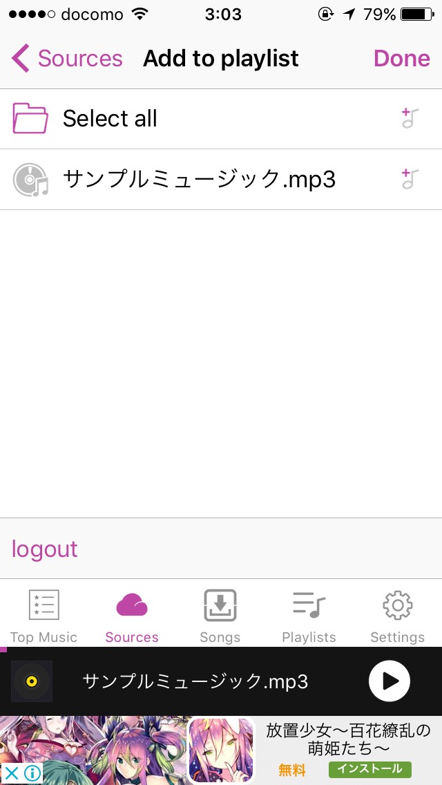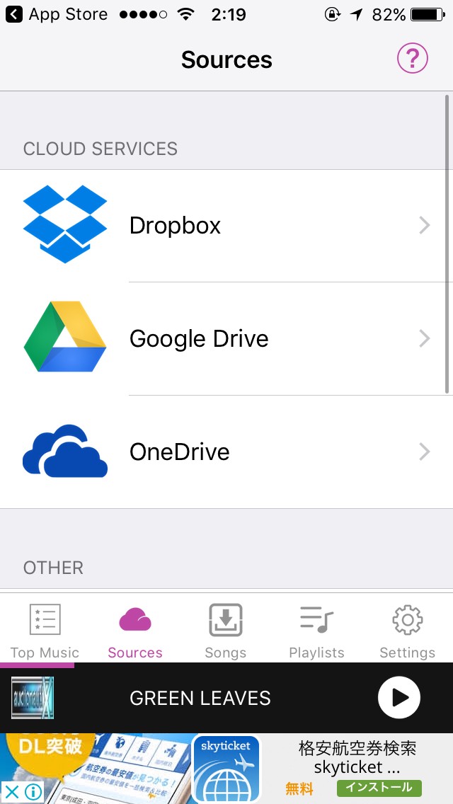 Google Drive内にある曲を再生したい場合は、「Sources」をタップした後に「Google Drive」をタップして、ログインすれば同じように音楽を再生することができます。