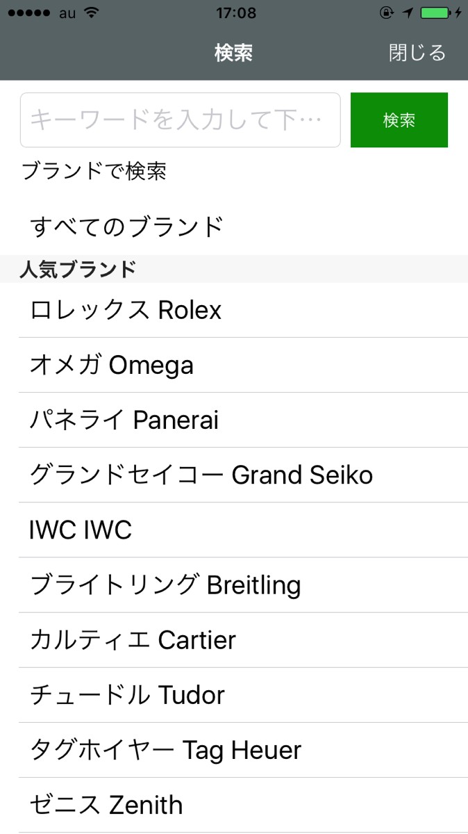 ・早速商品を見てみましょう。落札終了時間の期限が迫っているものから順に表示されています。画面上部の検索マークをタップすれば、キーワード検索が可能です。任意のキーワード入力も可能ですが、人気ブランドの一覧が載っているので、そこから選択して検索することもできます。気になるキーワードの商品が新たに出品されたら、通知を受け取る設定が可能です。