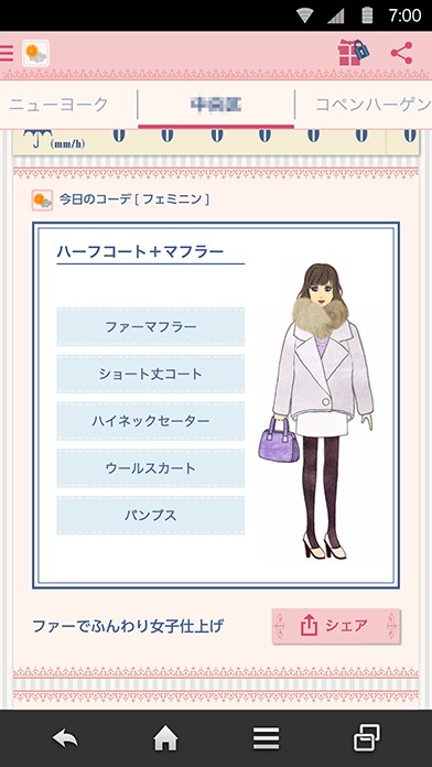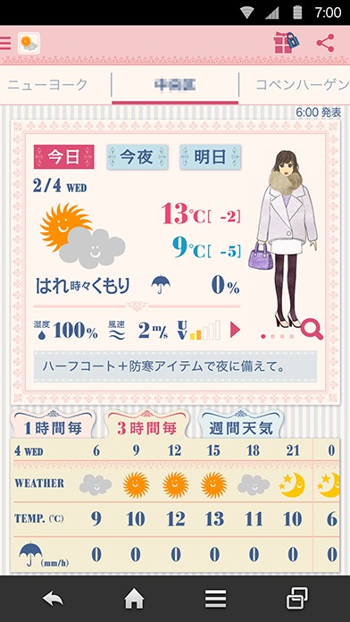 「おしゃれ天気」の機能はもちろんメインは「お天気」ですから、ここでもしっかりとした情報を提供しています。