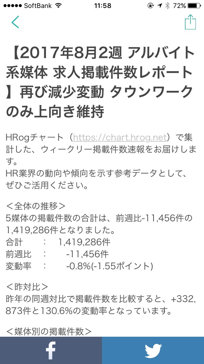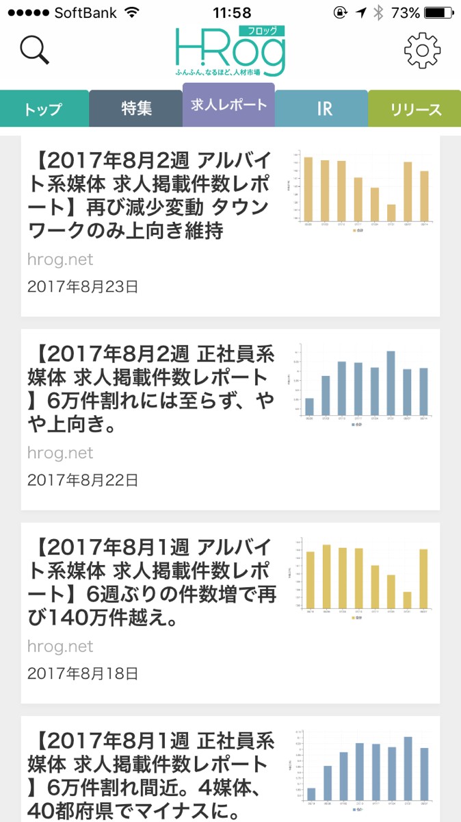 独自の求人マーケット分析レポートは、トップメニューの上にある「求人レポート」をタップすると表示されます。「2017年8月2週」などいつのデータベースなのかが、記事タイトルに入っているので最新情報をチェックしたいときに便利です。