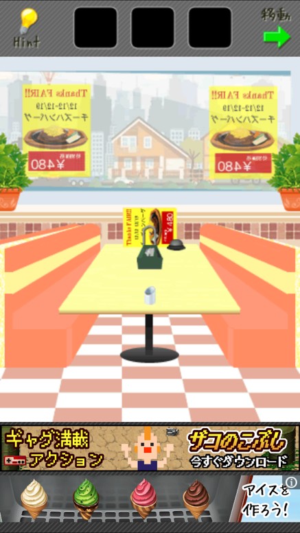 このゲームはヒントが2段階あるので、脱出ゲーム初心者でも100%クリアできる脱出ゲームシリーズです。 何故だかファミレスに閉じ込められてしまった。いろんなアイテムを使って脱出しましょう。