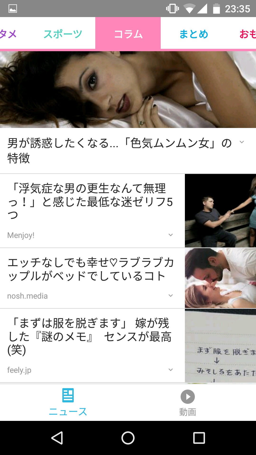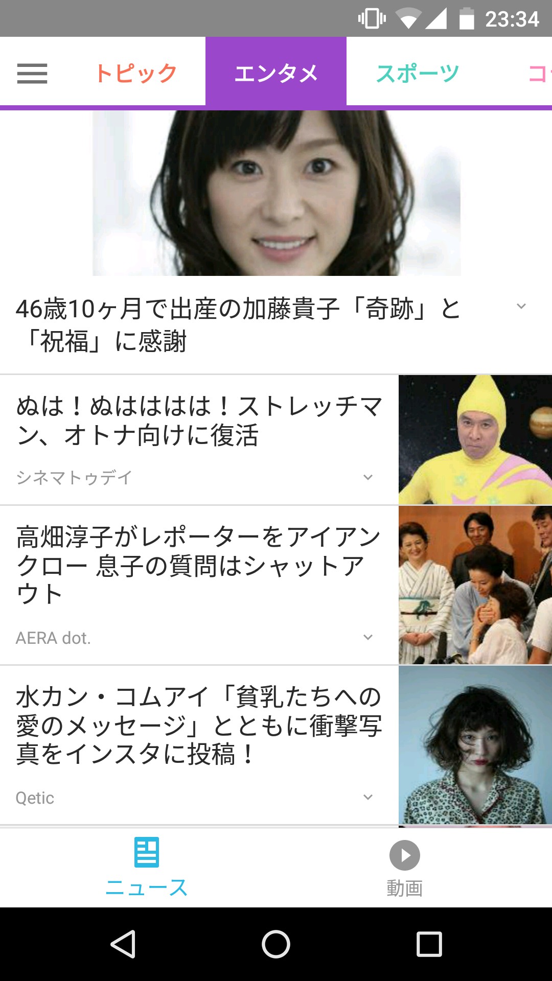 まずはテレビや新聞のニュースが一通りあり、スポーツニュースも一通り詳しくあり、そしてエンタメ情報が豊富に揃えられています。エンタメニュースは、その事柄をそのまま書いてあるのではなく、気になるようなフレーズを見出しに持ってくるので、思わず読んでしまう仕組みです。読んでしまってから、時間を無駄にしたと感じてしまう内容では無いのが特徴です。むしろ得をした感じすらあります。