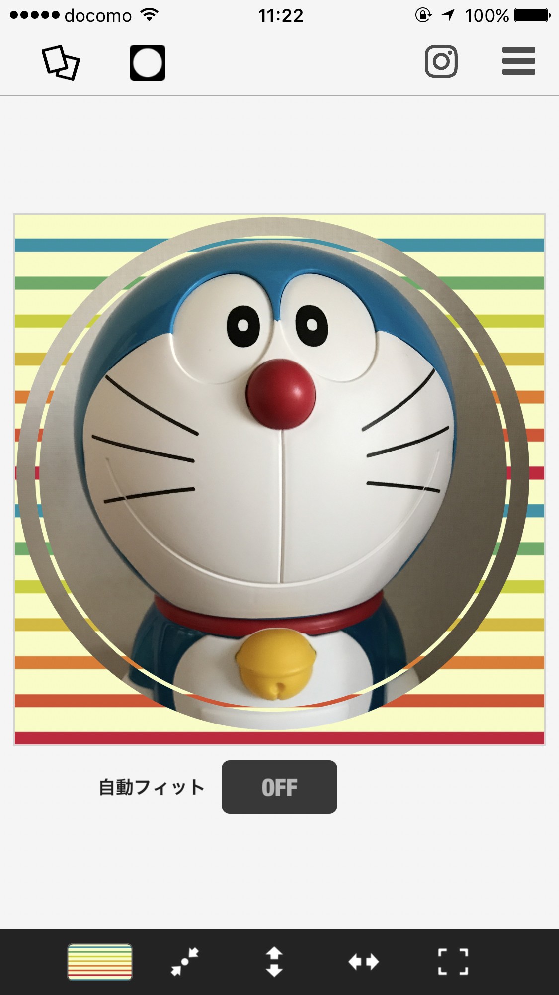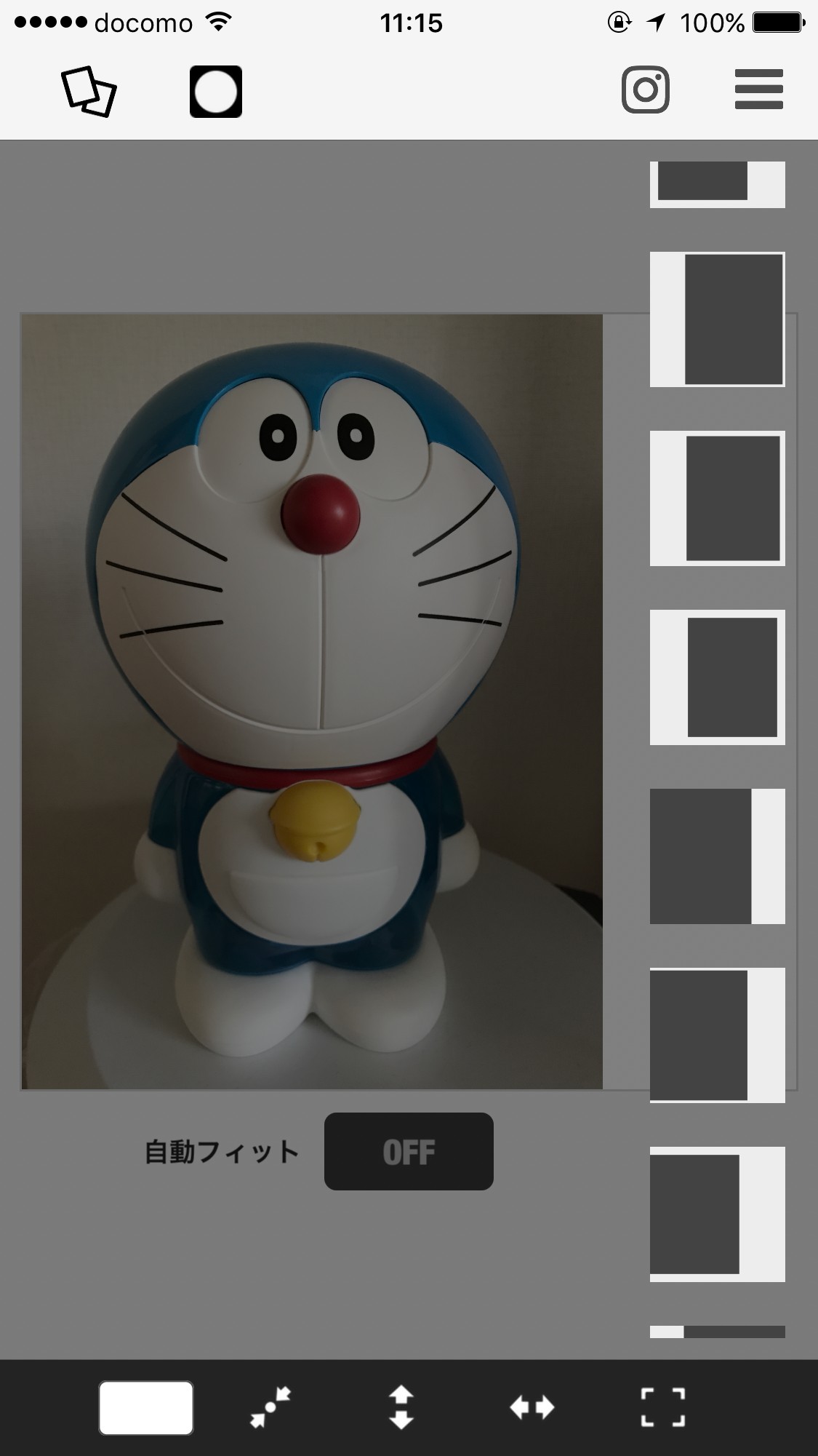 写真を選んだら写真の形を選びます。自動フィットをONにすると、写真を自動で正方形にしてくれます。OFFにすると、正方形だけではなく、長方形の様々なパターンで写真の形を変えることができます。