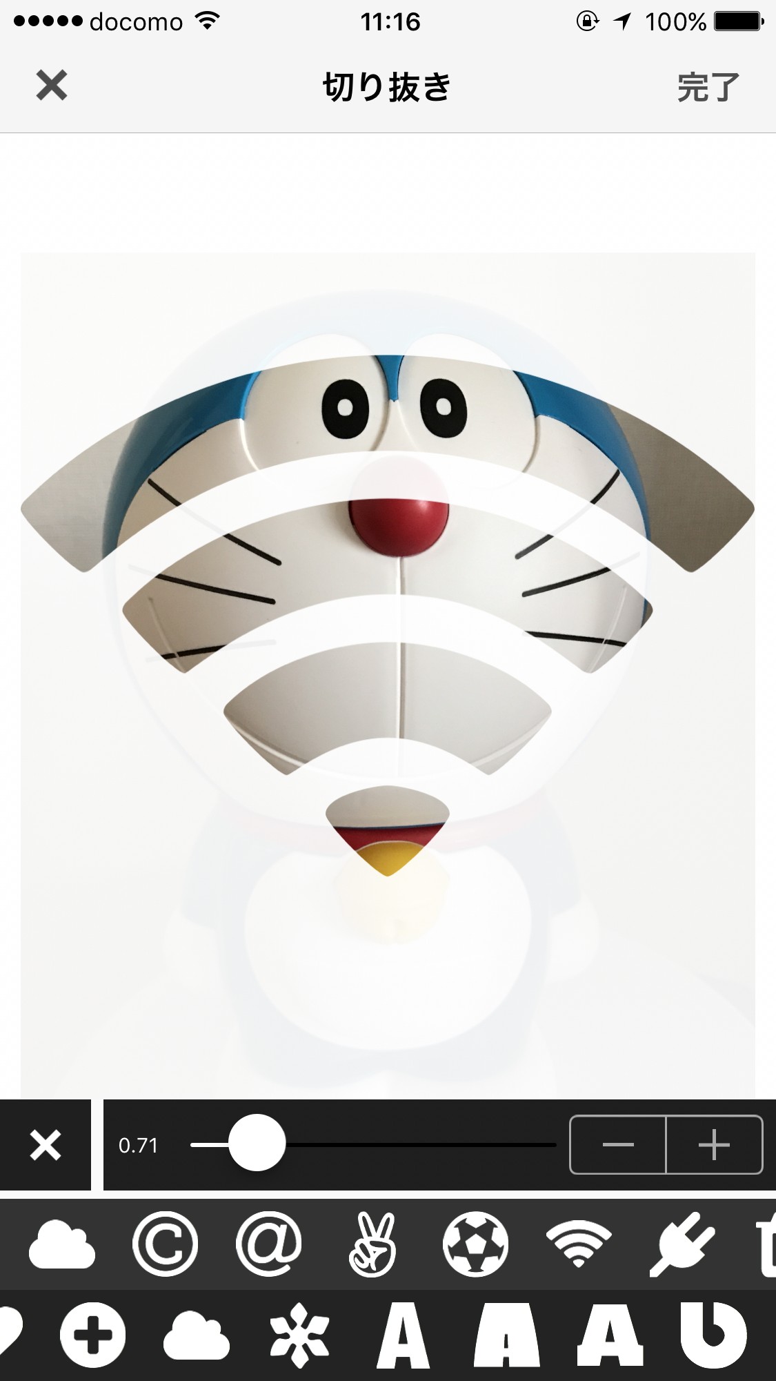 次に切り抜き加工です。切り抜きの種類は円やハート型、アルファベット型など14パターンあります。そして、さらにパターンごとに数十種類の形があります。たくさんそろえてあるので、飽きることはありません。切り抜き加工は、調整バーや「+」「-」ボタンで細かい調整が可能になっています。例えば「円」のパターンを選んでも、その種類は数十種類あり、さらには、細かい調整をすると同じパターンを使っても全く違った雰囲気の加工できるという訳です。