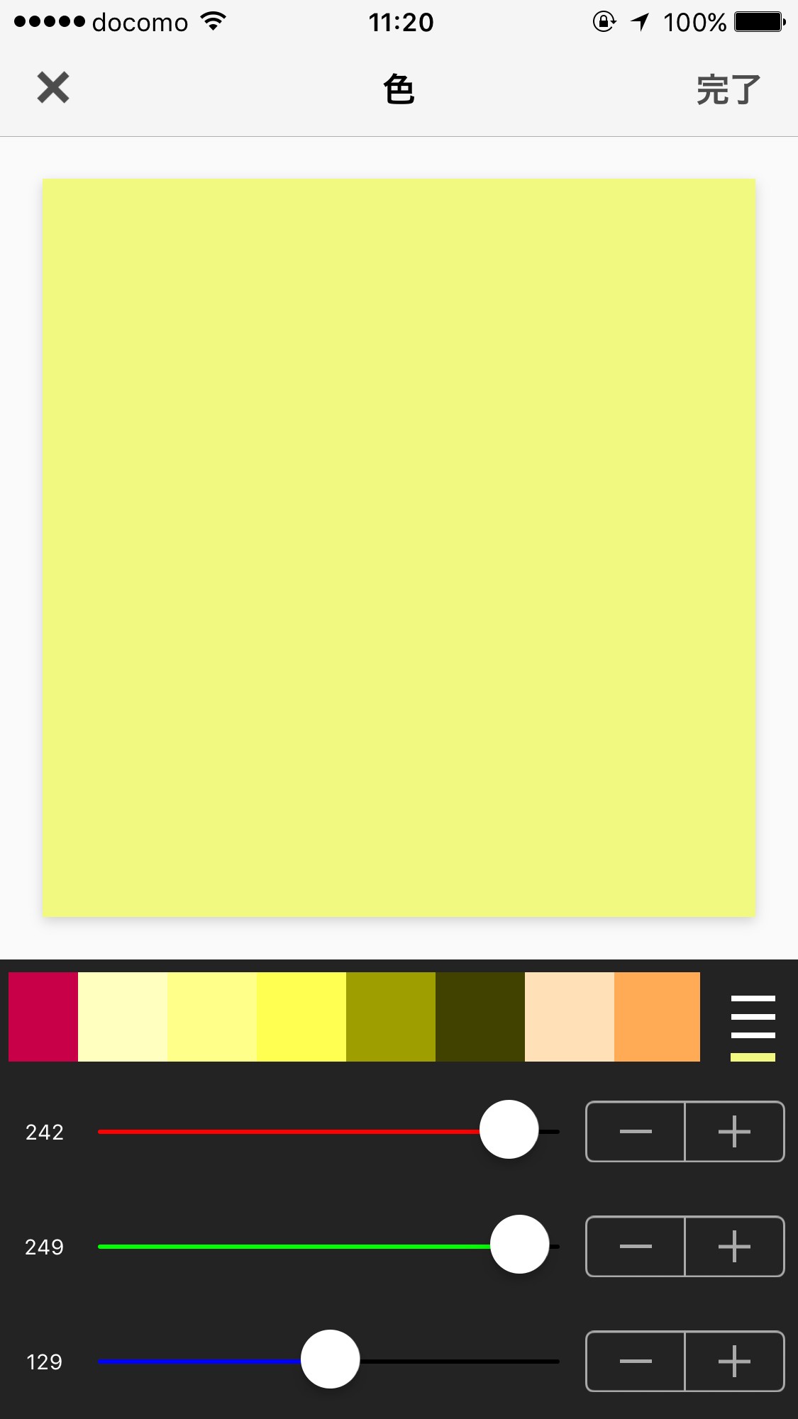 色をタップすると、様々な色が表示されます。そして、その色を「赤」「緑」「青」の調整バーを使ってさらに細かい調整ができます。例えば「黄色」を選んでも、「赤」を強調するのと「青」を強調するのでは全く違った色になります。色の変化も面白いですよ。