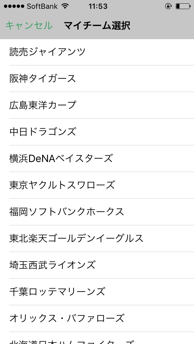 マイチームを選択してくださいとの表示をタップして、一覧から応援している球団名をタップします。この手順でマイチームの設定は完了です。次からマイチームのアイコンをクリックすると、すぐに応援球団の情報が一覧で手に入ります。特定の球団を応援している方には、魅力的な機能です。