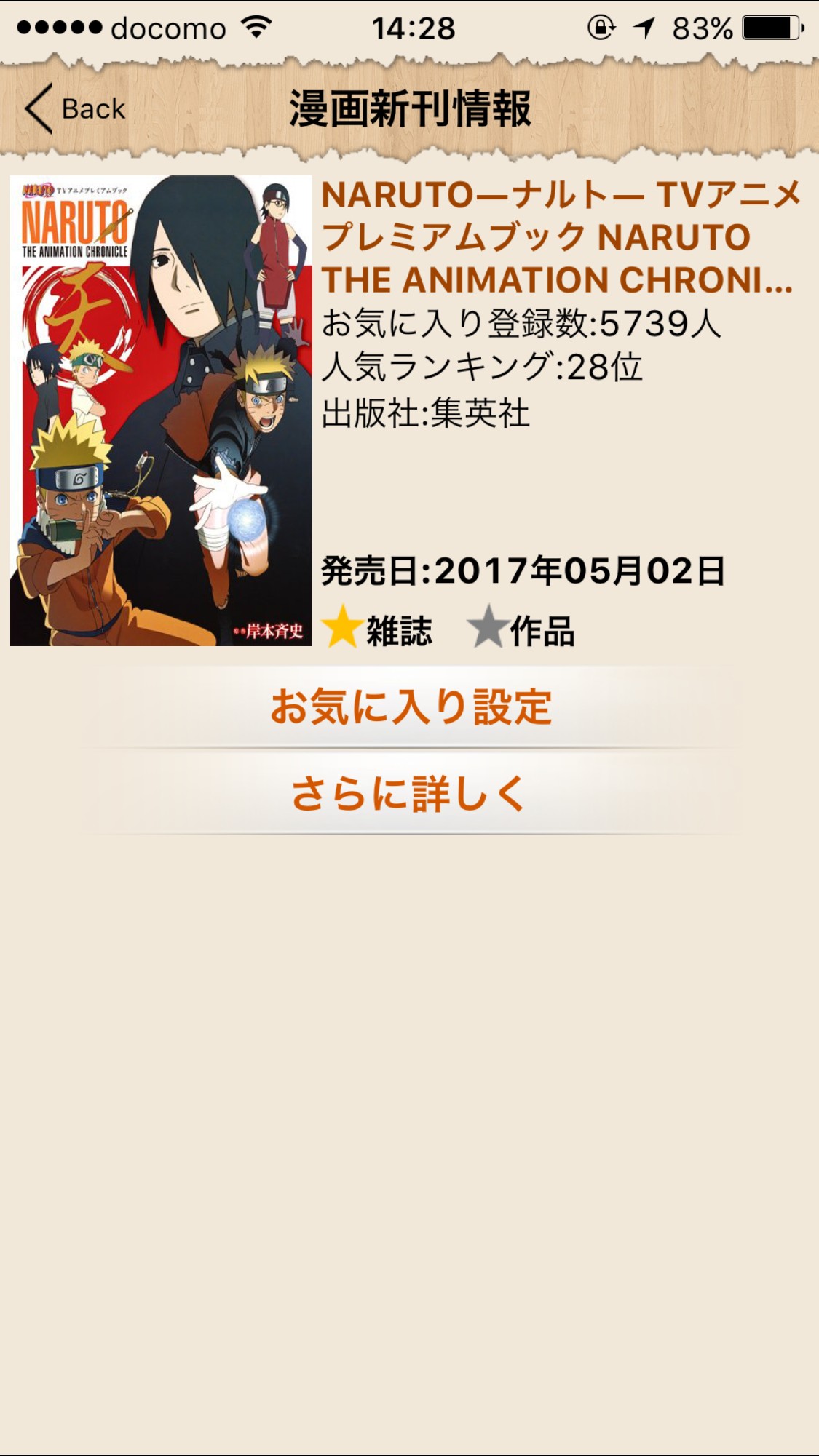 ここをタップすると、お気に入りに追加することができるのですが、その作品をただお気に入りに追加するだけではありません。雑誌、作者、作品、全部とお気に入りに入れる項目を選べるようになっています。例えば、この作品だけではなく、この作者のすべての作品が好きだという場合もあると思います。そんな時は、「作者」と「作品」をお気に入り設定に入れておくと便利です。お気に入りには、「作品」「作者」「雑誌」と分けて表示されますので、作者別でも簡単に調べることが可能になりますよ。