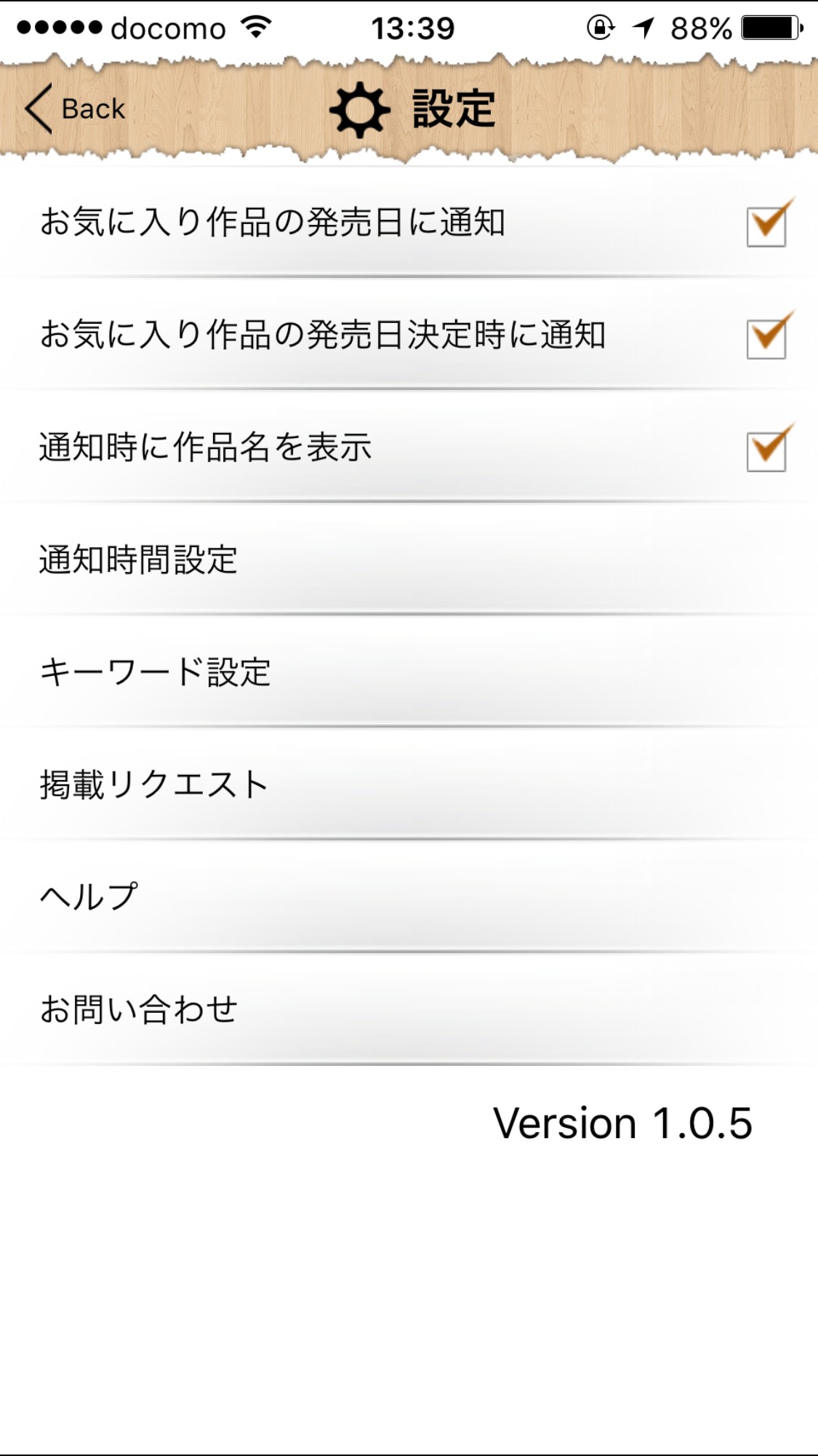 設定画面の中に「掲載リクエスト」とあります。そこに「雑誌名」「タイトル」「作者名」「その他」を入力して送信すると、対応してくれるんです。アプリの向上心を感じます。