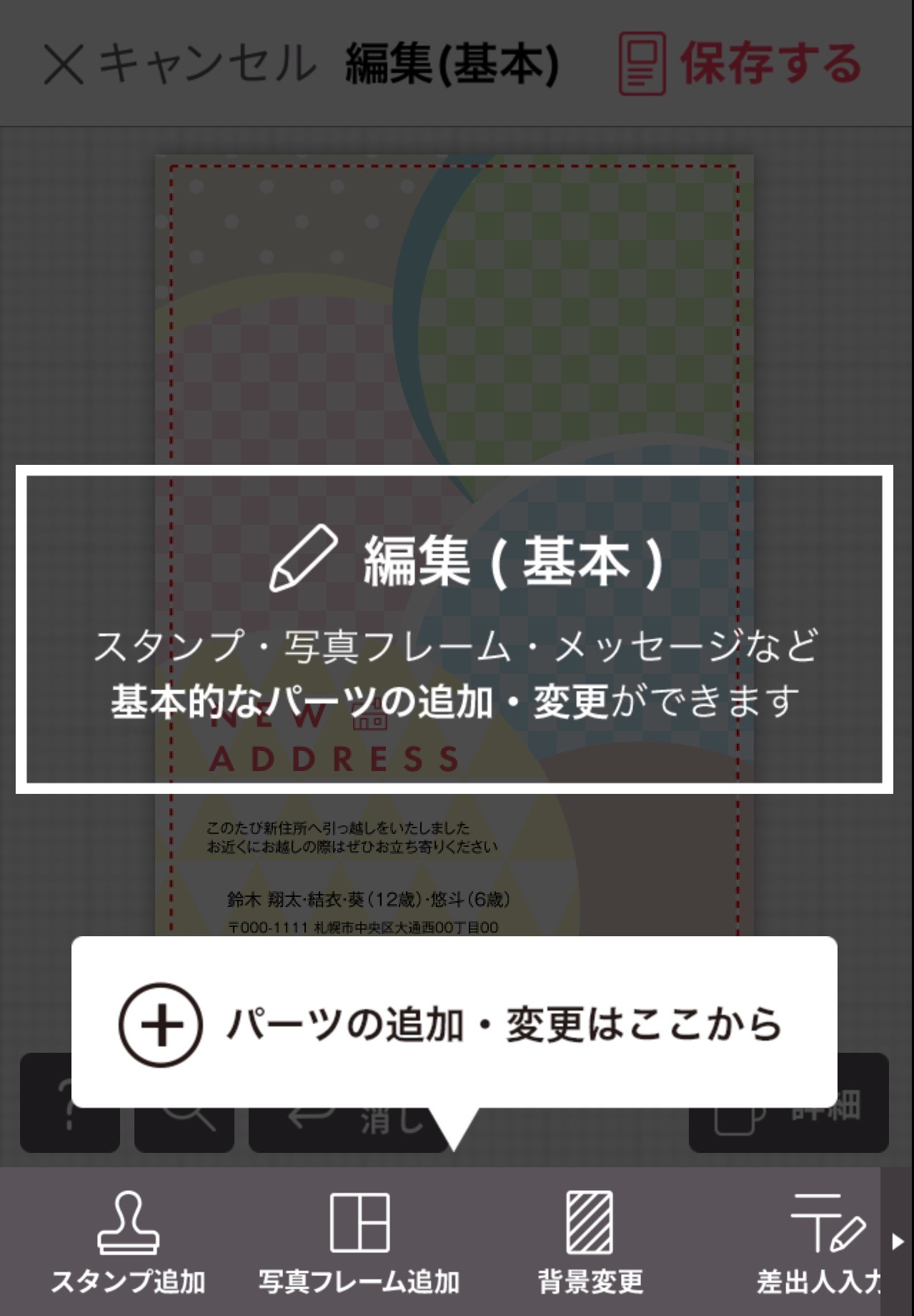 画面下部から、スタンプ追加、写真フレーム、背景変更、差出人入力、メッセージ追加、テンプレート変更が行えます。