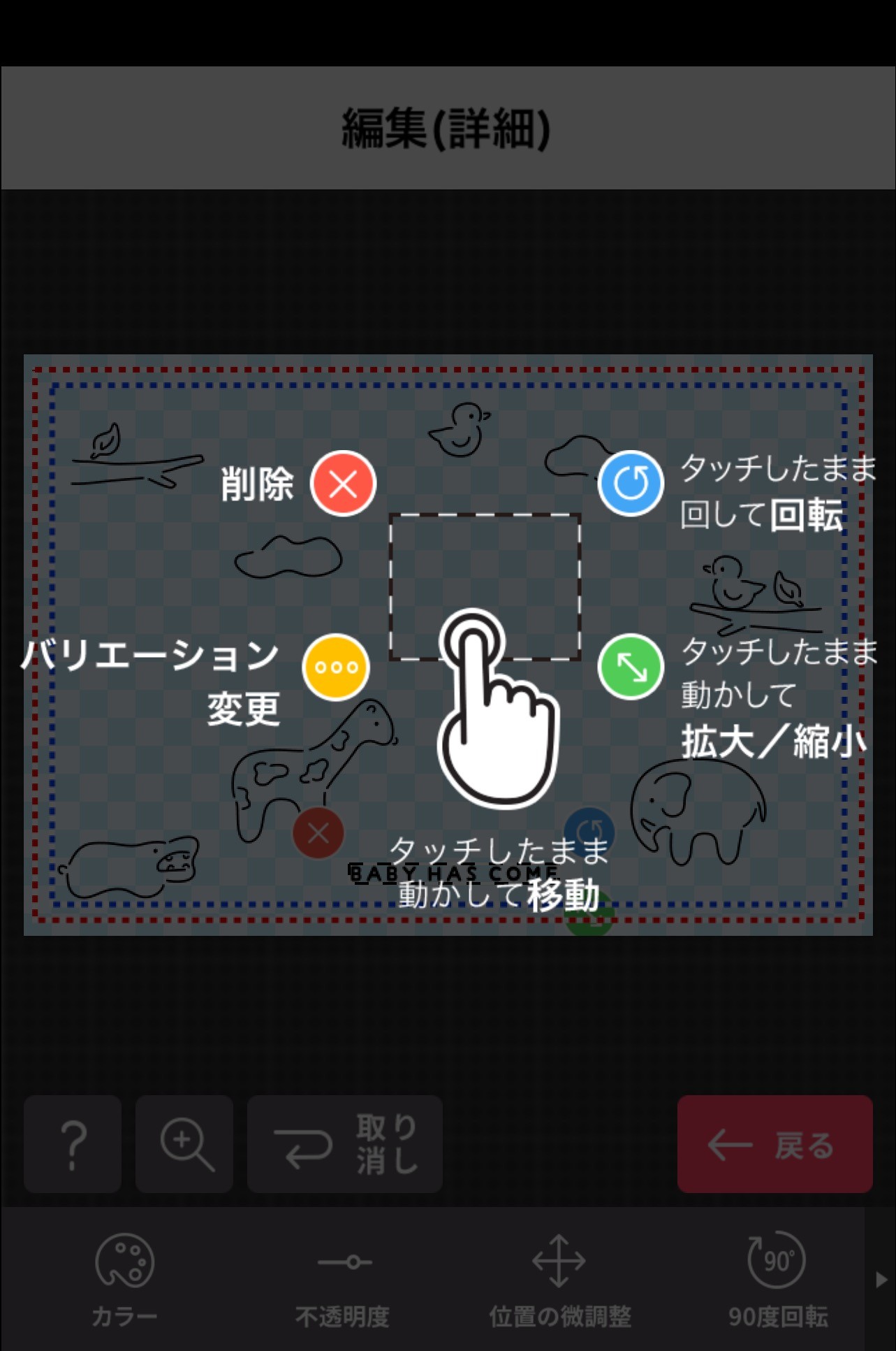 各要素の色、位置、大きさ、角度、文字の太さ、揃え、向き、レイアウトのカスタマイズを変更したい場合は、《基本モード》画面右下の「詳細」をタップします。「戻る」をタップすると《基本モード》に戻ります。