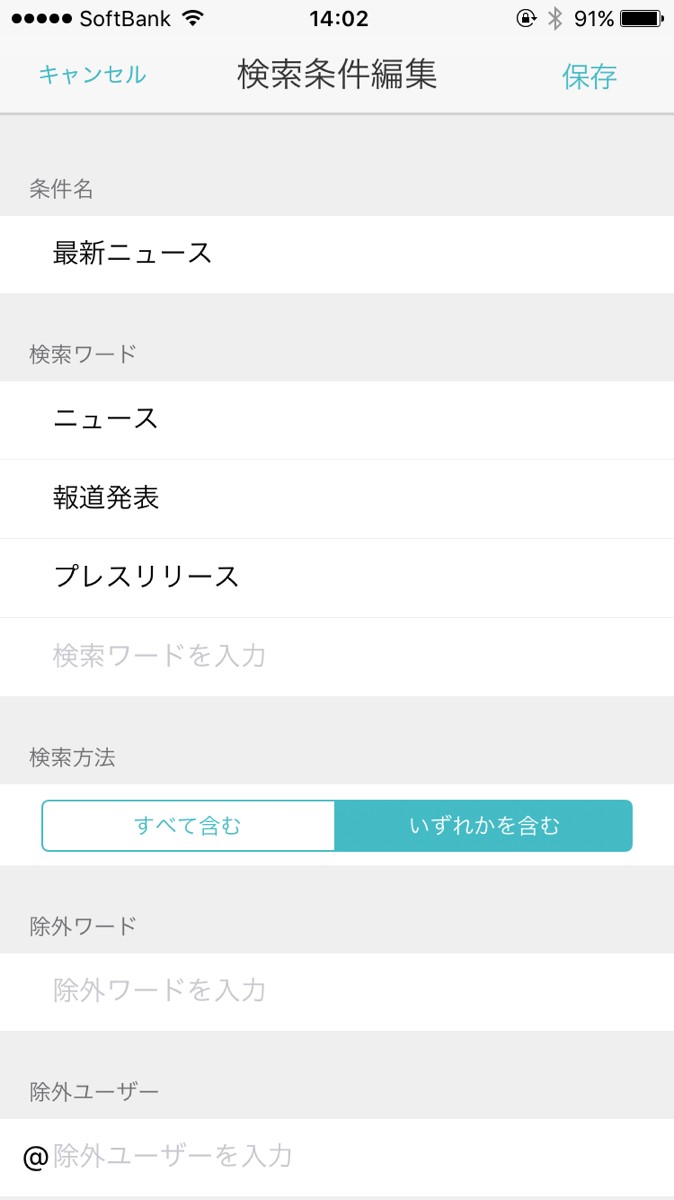 といった方に「egobird - エゴサーチ・検索に特化したTwitterクライアント」をおすすめします。複数の条件を設定できるため、本当に欲しい情報のみが表示されます。また、一度設定した条件は保存可能です。わざわざ検索し直さなくても良い点が嬉しいですね。保存した条件に新たに検索キーワードを追加したり、除外したりと編集が可能な便利なアプリです。