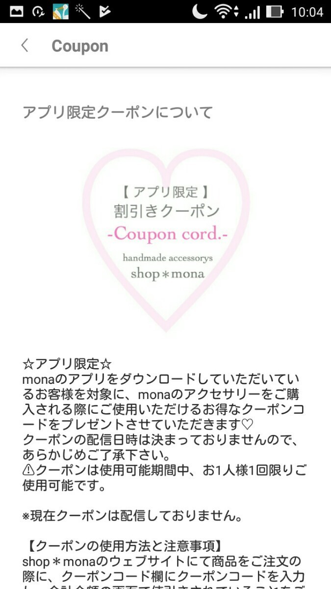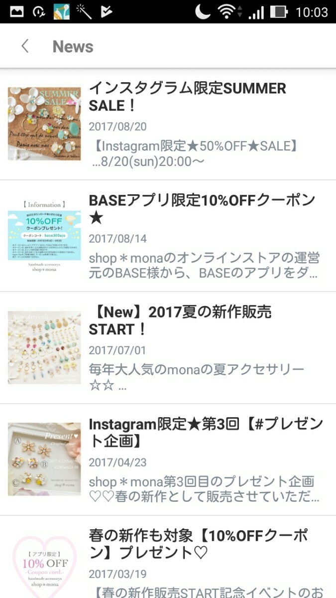新しい情報が入れば、プッシュ通知で知らせてくれますよ。「かわいいピアス・ハンドメイドアクセサリー shop*mona」のInstagramやNEWSをチェックして、旬なお得な情報をゲットしましょう。
