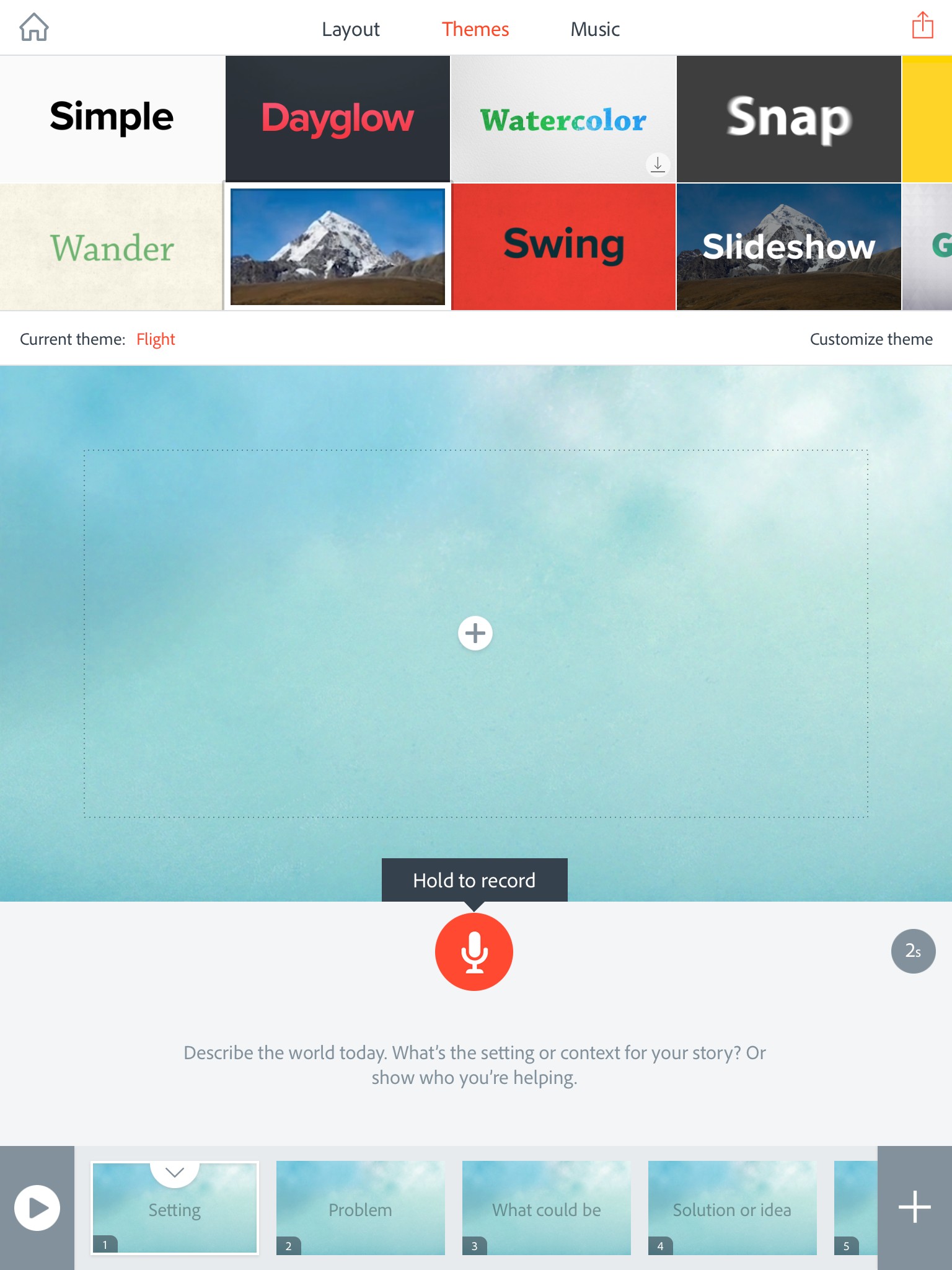 Adobe Spark Videoには、「Film」「Flight」「Impact」といったテーマが沢山用意されています。テーマを設定すれば、自動的にアニメーションが作成され、プロのような映像演出が可能になります。まさに、映画監督になった気分です。音楽も、「Happy」「Playful」「Relaxed」といった状況、シーン別にいくつものサウンドトラックが用意されているので、マッチする音楽を選んで配置すれば、映像がさらに引き立ちます。また、画面レイアウトもキャプションを入れる場合や、2画面構成などの選択肢が用意されていますので、自由に演出が可能です。
