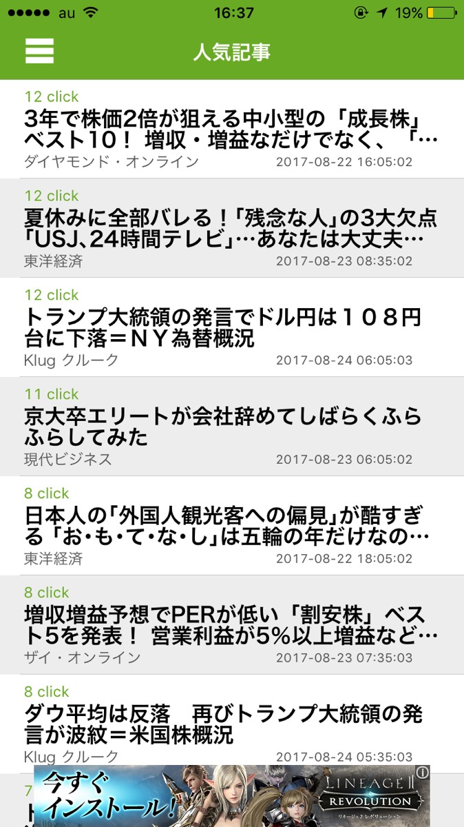 - アプリを起動させます。最初は「新着記事」の一覧が表示されます。気になる記事をタップすればその記事が載っているサイトへとびます。自分が見れば「click」の数が増えます。