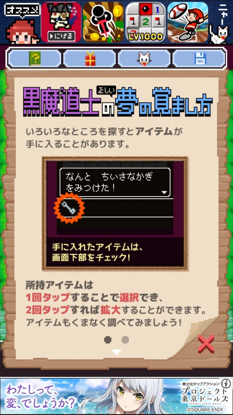 途中で詰まる場合もあると思いますが、その場合は画面上部右から2番目のボタンをタップするとヒントがシロネコから与えられます。