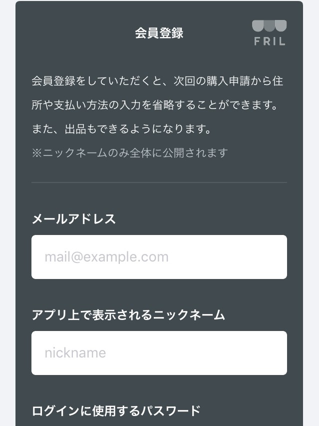 フリルでは、商品購入時にその都度名前や住所、電話番号などを入力する手間を省くために会員登録をすることができます。