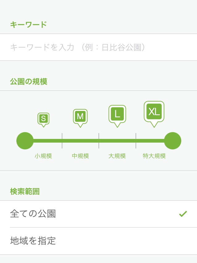 GPS機能をオンすることで自動で最寄りの公園をアプリが紹介してくれますが、GPS機能のオンに抵抗があるという方は、検索画面からエリア検索が可能ですのでそちらから公園を探してみて下さい。