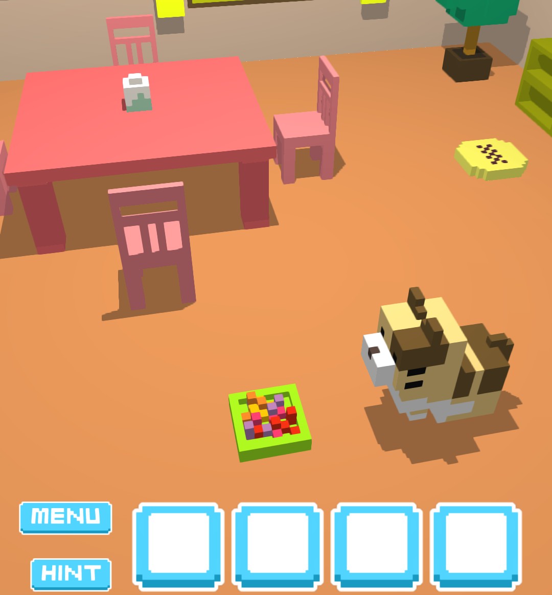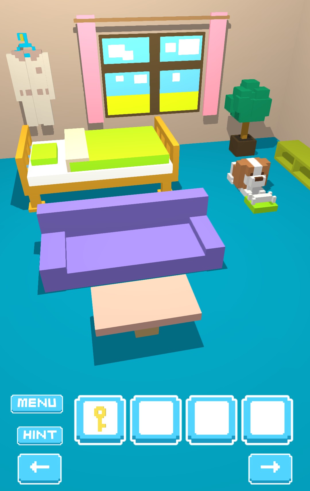 お手軽に楽しめる「VoxelRoom」では最初のステージでは室内に入るとカギが置いてあるほどで、ちょっとした着眼点がすぐに回答になっていきます。犬のいる部屋の攻略はとにかく簡単なので、まずは色々なところをタップしてカギを探し出していきましょう。